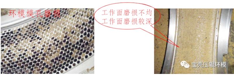 当环模孔磨损,内表面变得凹凸不平,阻碍物料流动;同时出料各小孔内壁磨损,孔径增大,所生产的颗粒饲料直径变大,这不仅降低了环模的使用寿命,还直接影响到生产效率和颗粒饲料的成品质量。
