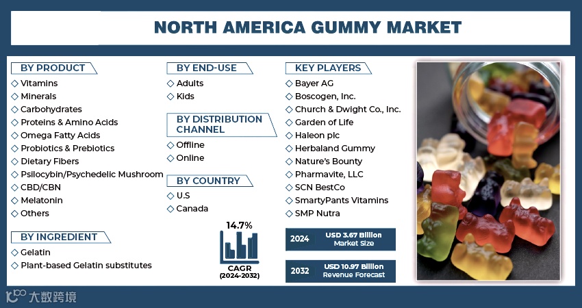 全球软糖补充剂将以14.5%的年复合增长率上升,在2028年市值将达到485亿美元,其中北美地区仍然是主要的需求地区(markets and markets数据)。我们可以看到,软糖产品按照产品分类,主要应用于维生素、矿物质、碳水化合物、蛋白质氨基酸和脂肪酸、益生菌益生元等产品,覆盖大部分的膳食补充剂品类。