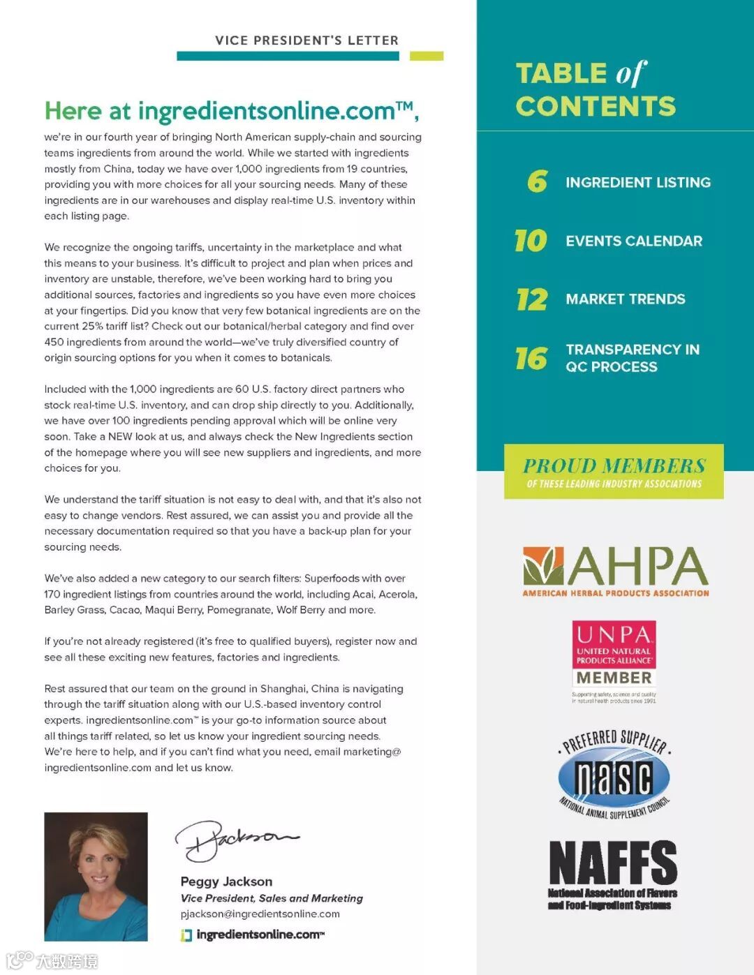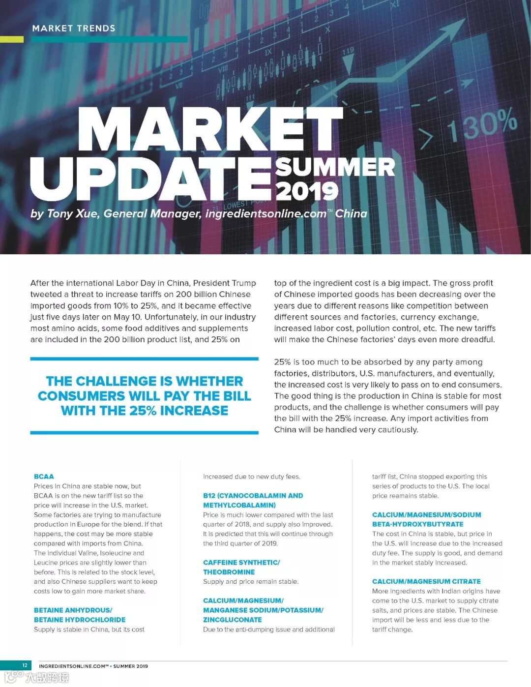 进入六月,伴随而来不仅有夏季的炎热,还有关税的考验。5月10日将2000亿美元中国输美商品的关税从10%上调至25%,原料行业也受到波及。我们该如何应对?ingredientsonline.com2019年第三期(夏季刊)围绕该关税话题展开。北美原料直销网的市场总监Peggy对此发表了自己的看法,中国上海公司的总经理Tony Xue对加征关税下的市场形势进行了解读。