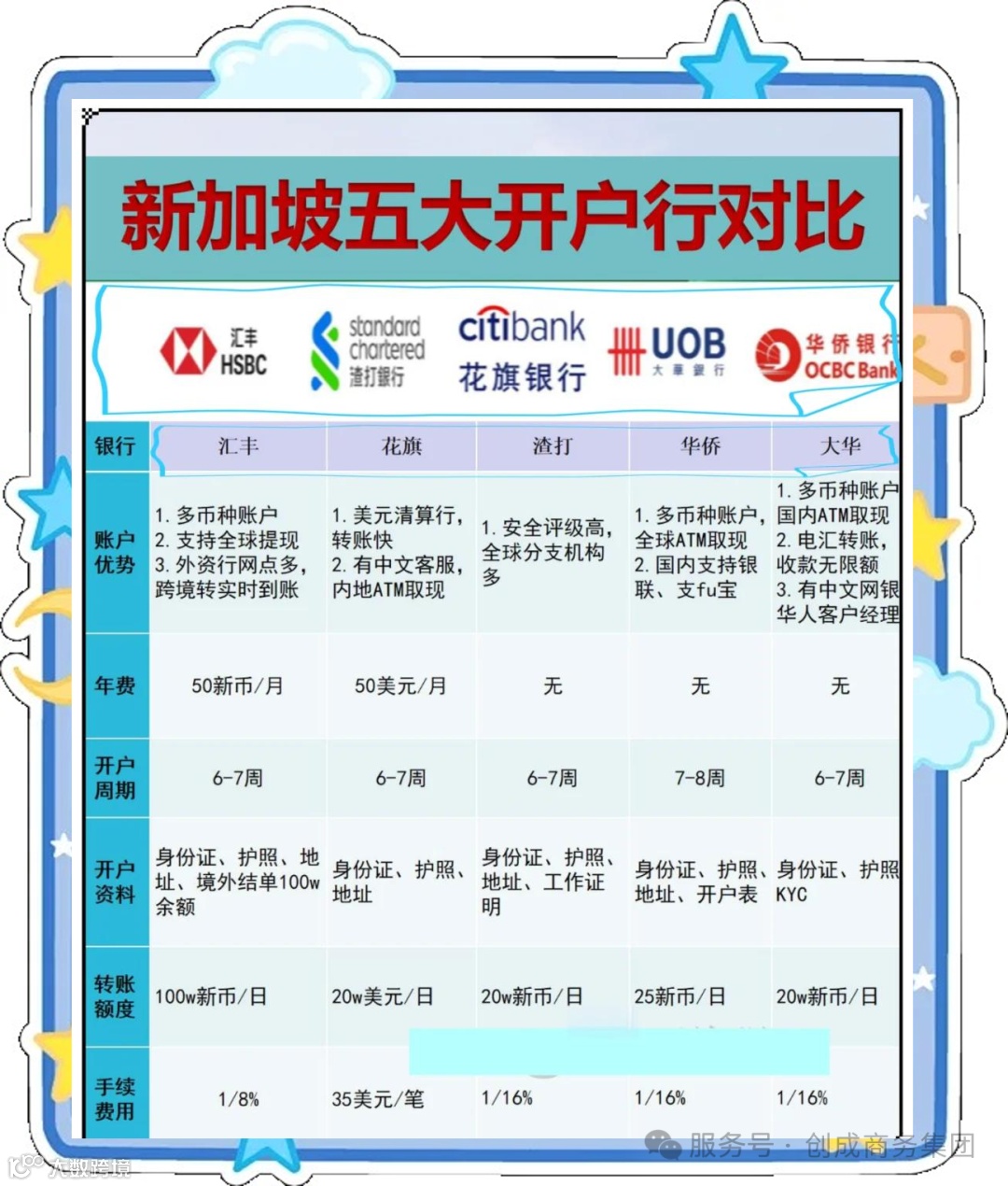 开户费:个人账户免费,企业账户300新币; -
