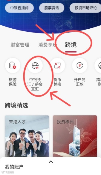 登录中银香港APP → 点击【跨境】→ 选择【中银快汇/薪金直汇】。如下图: