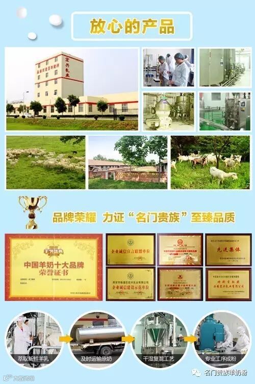 系出名门,奶中贵族。西安宏兴乳业名门贵族羊奶粉建立专业羊奶产品技术研发中心,中心内聚集着国内著名的高级营养学专家、高级乳品检测专家和高级乳品生产技术专家,企业集中行业优势资源,吸收引进国内外最新科研及专利成果,深入研究婴幼儿需求,对婴幼儿免疫功能提高做系统研究,独创“盾立方保护系统”,本着与妈妈们一道,共同提高宝宝抵抗力,给宝宝更全面、更营养、更安全的食品为目标,力求为妈妈们提供最好的专家级配方羊奶粉。