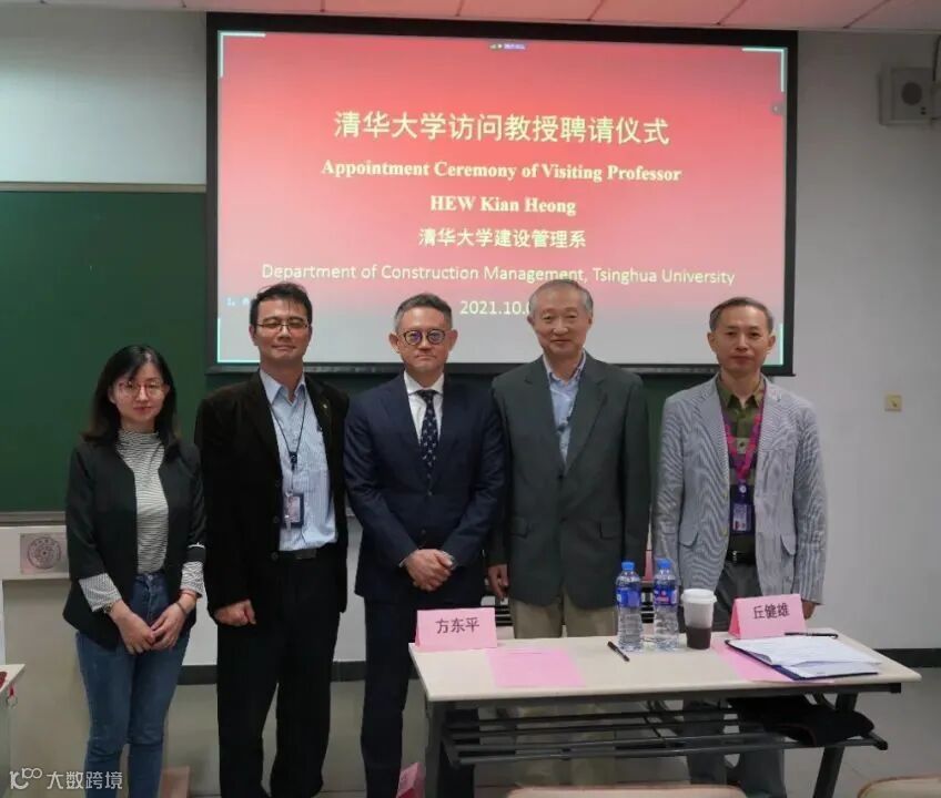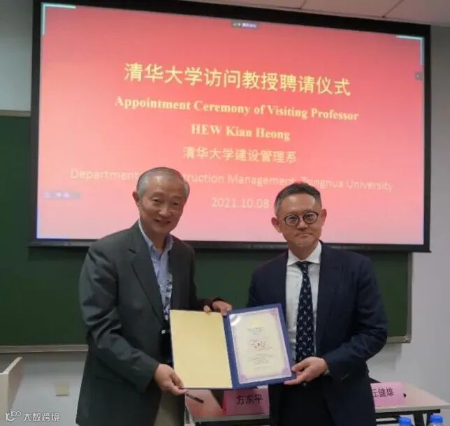 2021年10月8日,在清华大学第六教学楼内举办了丘健雄律师访问教授聘请仪式。清华大学建设管理系副教授廖彬超(推荐人)向在座师生介绍了丘律师的履历及在行业内的成就。随后,清华大学土木水利学院院长方东平和丘律师现场签署了聘书,并向丘律师颁发了荣誉证书。