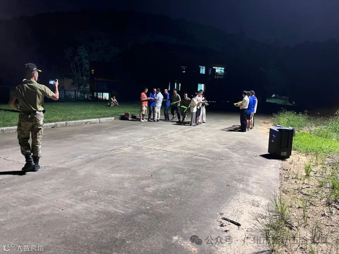晚宴后的高潮部分莫过于培训基地教官精心设计的互动游戏环节。我们快速步行赶到培训场地,团队建设活动随即展开,培训教官集合整队,快速地讲清楚了游戏活动项目与要求以及奖罚规则,安排按到场的团建成员自由组合成三个小组,每组需同等人数,要求每个小组在3分钟内,选出队长,成立队名与口号,锻炼了我们的领导力与执行力。