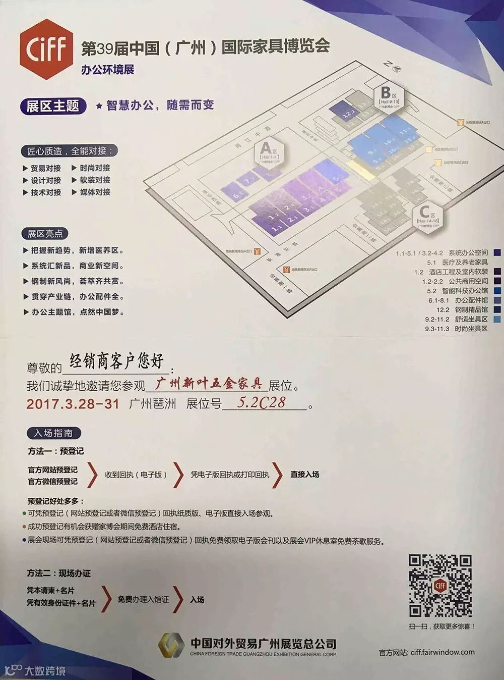 您好!我们诚邀您来参加广州国际家具展览。届时,为您带来一次史无前例的时尚潮流产品,望您在夺忙之中抽出时间参观我公司展位5.2C28。我们期待您的莅临!