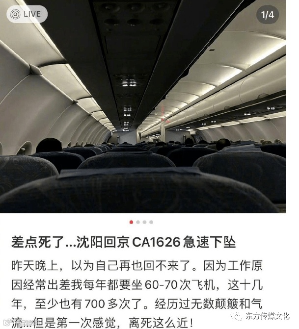该网友还称,之后飞行员快速拉升飞机,“整个飞机倾角大约60度,但是颠簸更加严重。持续了3-5分钟左右,飞机开始急速下坠,这种失重感持续了几十秒,我像自由落体一样。”