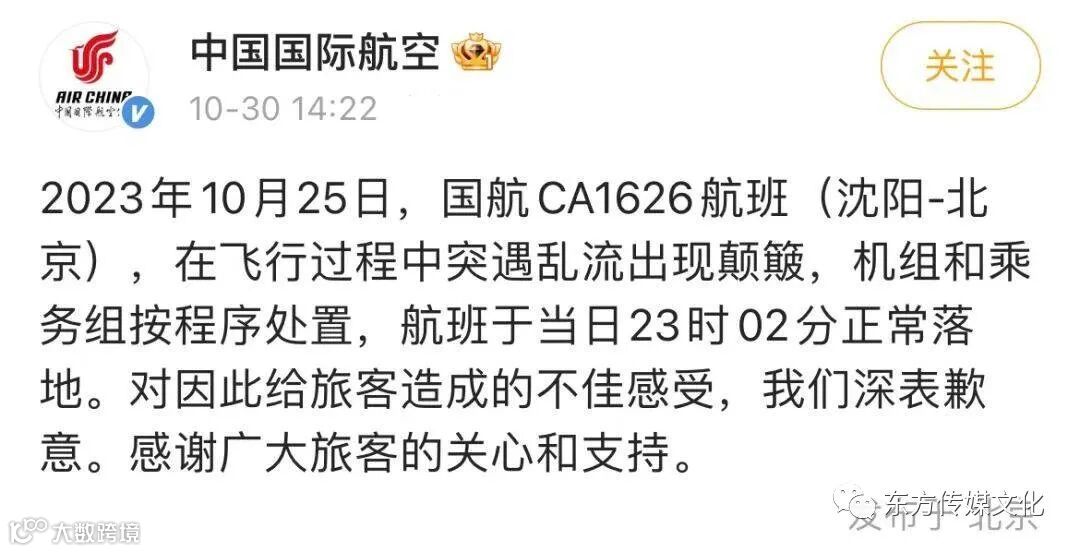 @中国国际航空 10月30日消息:10月25日,国航CA1626航班(沈阳-北京),在飞行过程中突遇乱流出现颠簸,机组和乘务组按程序处置,航班于当日23时02分正常落地。对因此给旅客造成的不佳感受,我们深表歉意。感谢广大旅客的关心和支持。