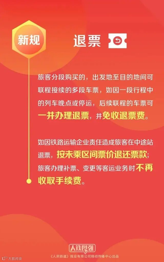 四是让旅客享受更多优惠。旅客分段购买的,出发地至目的地间可联程接续的多段车票,如因一段行程中的列车晚点或停运,后续联程的车票可一并办理退票,并免收退票费;如因铁路运输企业责任造成旅客在中途站退票,按未乘区间票价退还票款;旅客办理补票、变更等客运业务时不再收取手续费。