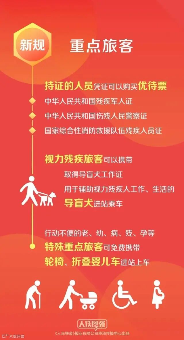 三是切实关爱重点旅客出行。明确了持中华人民共和国残疾军人证、中华人民共和国伤残人民警察证、国家综合性消防救援队伍残疾人员证的人员凭证可以购买优待票。明确视力残疾旅客可以携带取得导盲犬工作证,用于辅助视力残疾人工作、生活的导盲犬进站乘车。行动不便的老、幼、病、残、孕等特殊重点旅客可免费携带轮椅、折叠婴儿车进站上车,出行更加便捷。