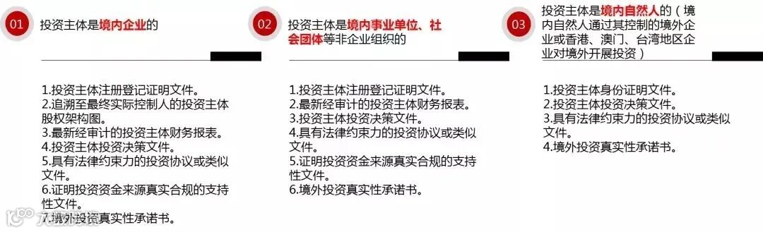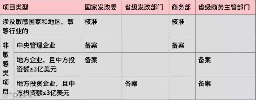 如投资非敏感类项目,分两种情况:情况一,境内企业直接投入资产、权益或提供融资、担保,则需要履行备案手续;情况二,境内企业不投入资产、权益或提供融资、担保,则中方投资额3亿美元以上需要提交大额非敏感类项目情况报告表,3亿美元以下无需提交。