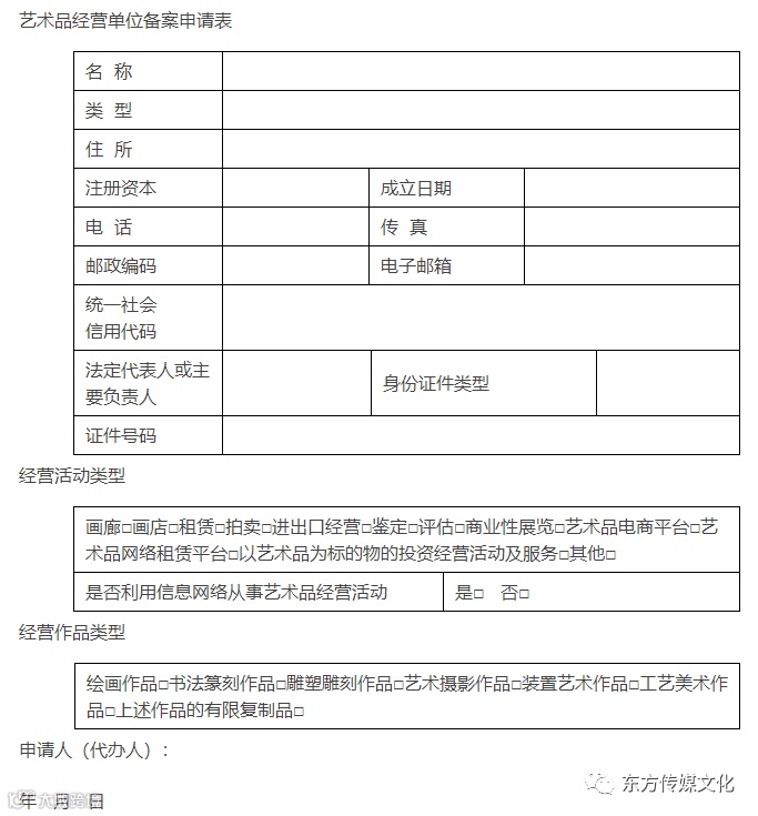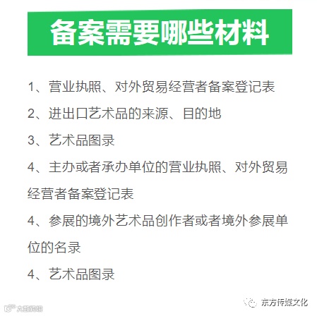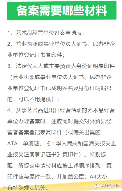 画廊、画店、租赁、拍卖、进出口经营、鉴定、评估、商业性展览、艺术品电商平台、艺术品网络租赁平台、以艺术品为标的物的投资经营活动及服务等需要进行备案。