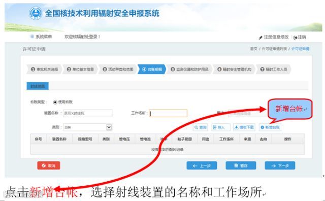 5、台帐明细,该处要对应基本信息页中活动种类和范围,如果首页活动种类和范围选择的只有使用射线装置,系统只会显示射线装置使用台帐;放射源台账是通过业务办理直接进入台账,无法手工添加;非密封放射性物质不需要添加台账。