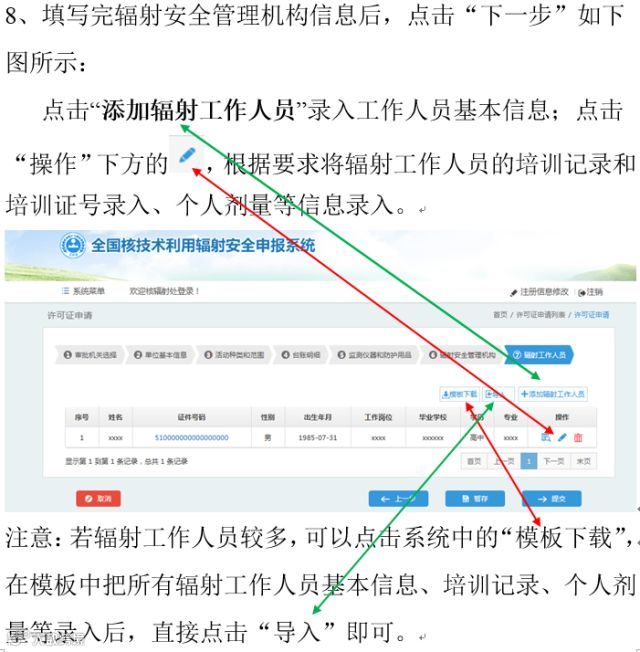 7、填写完监测设备及辐射防护用品后,点击“下一步”,如下图所示: