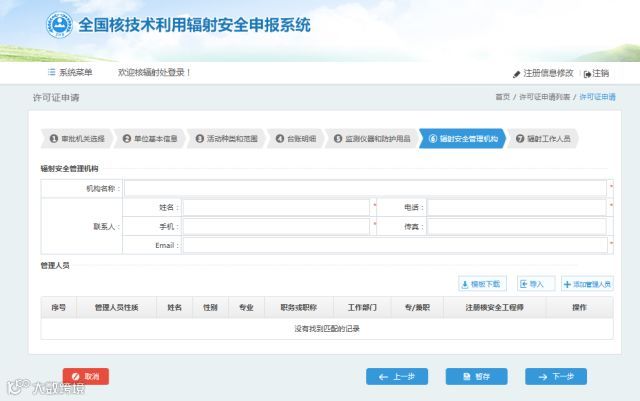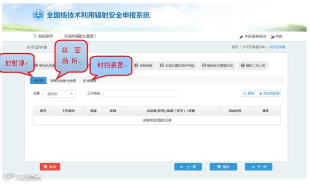 注意:单位基本信息中带有*号的为必填项,其中,“添加涉源部门及场所”必须填写(涉源部门并非专指放射源,而是指代辐射源)。