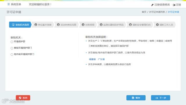 此处应根据本单位申请许可的类型选择对应的审批机关。如选择“生态环境部(原环境保护部)”,监管系统则由国家级审批人员审批;选择“省级环境保护部门”,监管系统则由该省级审批人员审批;选择“地市级环境保护部门”,监管系统则由地市级审批人员审批。