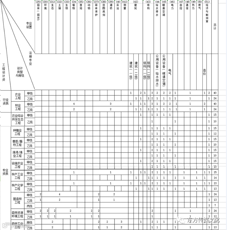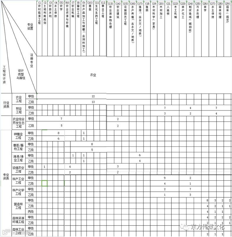 4、申请农林行业(农业工程)资质,在满足专业技术人员数量的基础上,(1)—(18)的工艺专业设置,甲级资质应配备其中至少12个专业;乙级资质应配备其中至少7个专业。