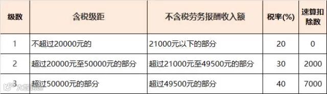 当月收入高于4000元的时候按照80%计入应纳税所得额,然后对照劳务报酬所得税率表计征个人所得税,分为三个税率阶段: