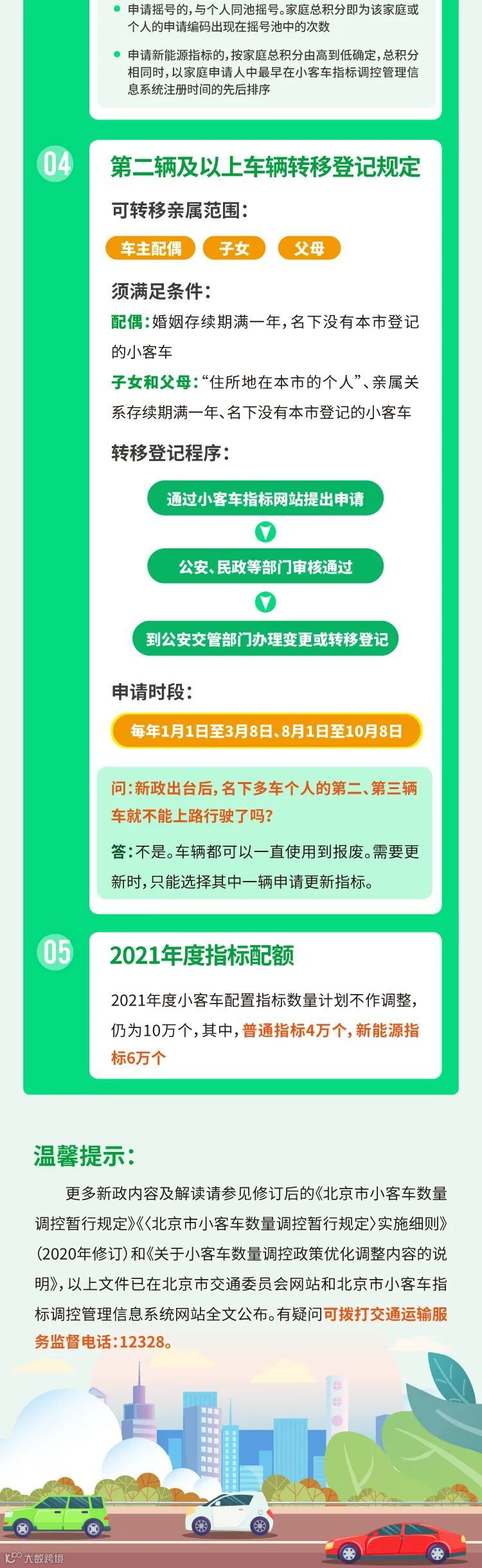 《北京市小客车数量调控暂行规定》和《实施细则》正式公布。增加以“家庭”为单位的摇号新规,同时提出,推动个人名下第二辆及以上的小客车有序退出。新政将于2021年1月1日起正式实施。