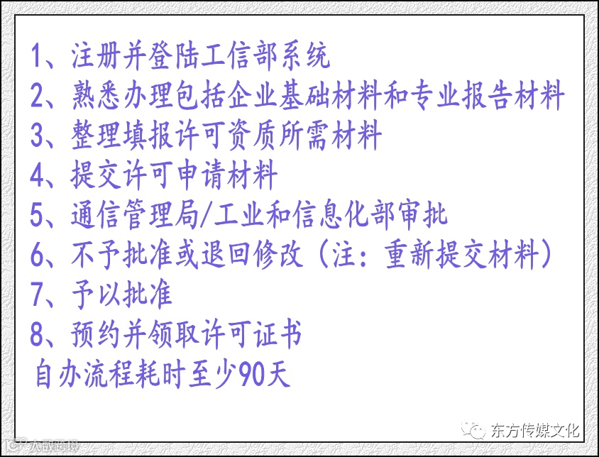 互联网资质类:ICP、EDI、SP、ISP、IDC、CDN、ISBN等增值类电信业务许可证、呼叫中心许可证、国内多方通信服务业务、网络文化经营许可证、互联网药品信息服务许可证、网络出版许可证、互联网新闻信息服务许可证、信息安全等级保护系统等;
