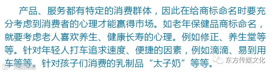 商标名称一般都很简短,只能显示商品某一方面的特点,因此就要求商标命名时应尽量突出让消费者关注的方面,比如产品使用的技术、原料、产地等等。例如飘柔、立白、云南白药、青岛啤酒、贵州茅台、蒙牛。