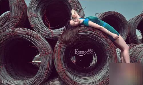 上图中画面以圆形为主,拍摄模特在摆拍时也倚在金属物上充分发挥这一点,呈现出一种相得益彰的弧线美,蓝色的衣服与褐色的头发与照片整个色调相融合,十分和谐。