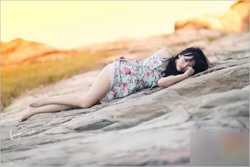 上图中三分法的构图将模特置于画面中央,上有夕阳下有岩石的衬托,视觉空间产生一种延伸感,更加突出了被摄主体。