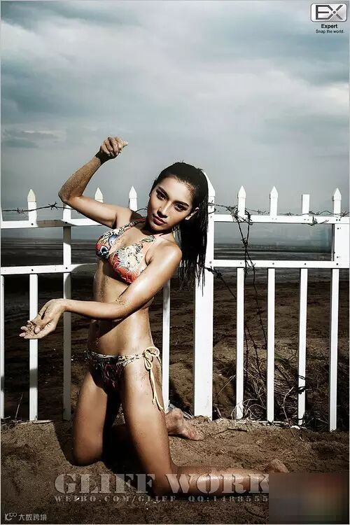 上图的巧妙之处在于把人物放在了等高的栏杆处,垂直的栏杆产生上下延伸感,使画面更为紧凑。光影把模特古铜的肤色及立体的身体绘影出来,毫无重叠感,让主题凸显又具有张力。