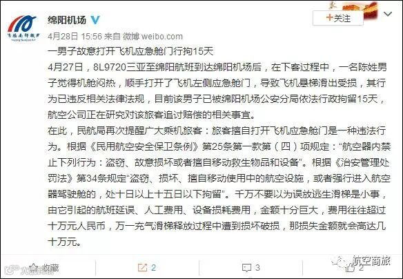 据四川省绵阳民航管理局官方微博@绵阳机场4月28日消息,4月27日,8L9720三亚至绵阳航班到达绵阳机场后,在下客过程中,一名陈姓男子觉得机舱闷热,顺手打开了飞机左侧应急舱门,导致飞机悬梯滑出受损,其行为已违反相关法律法规,目前该男子已被绵阳机场公安分局依法行政拘留15天,航空公司正在研究对该旅客追讨赔偿的相关事宜。