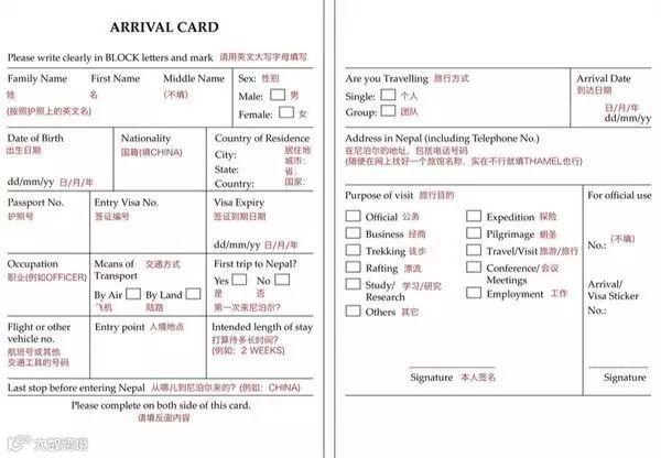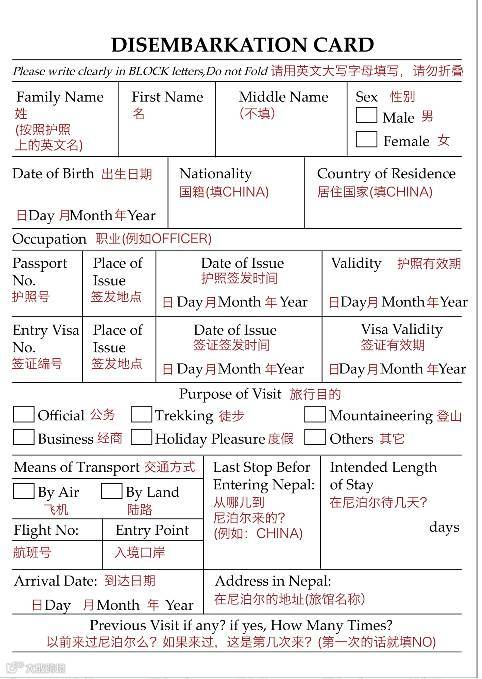 尼泊尔入境卡