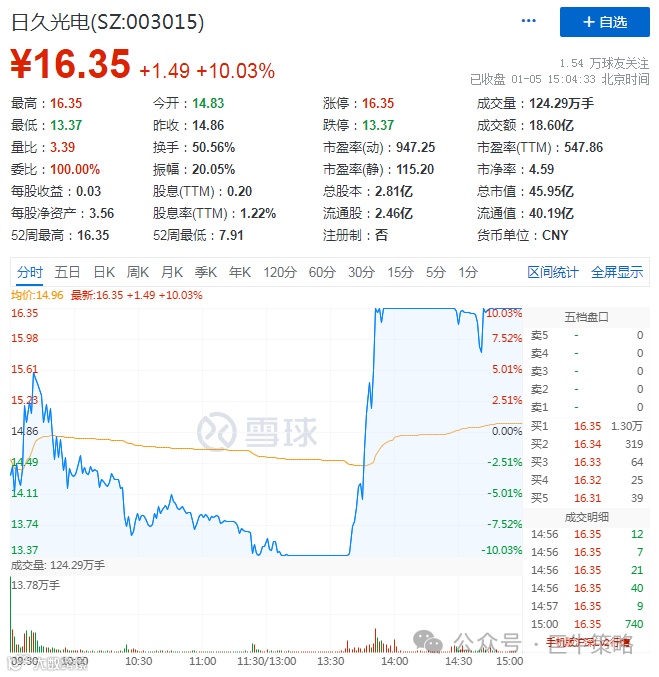 虽然最后日久光电涨停收盘,但中间经历了一个跌停,这不是正常人能赚到的钱,早盘冲高给机会就跑,持有两天总共获利15%左右。没有吃完全部盈利,但不后悔,也不遗憾。摆正态度,把握好属于自己的机会。
