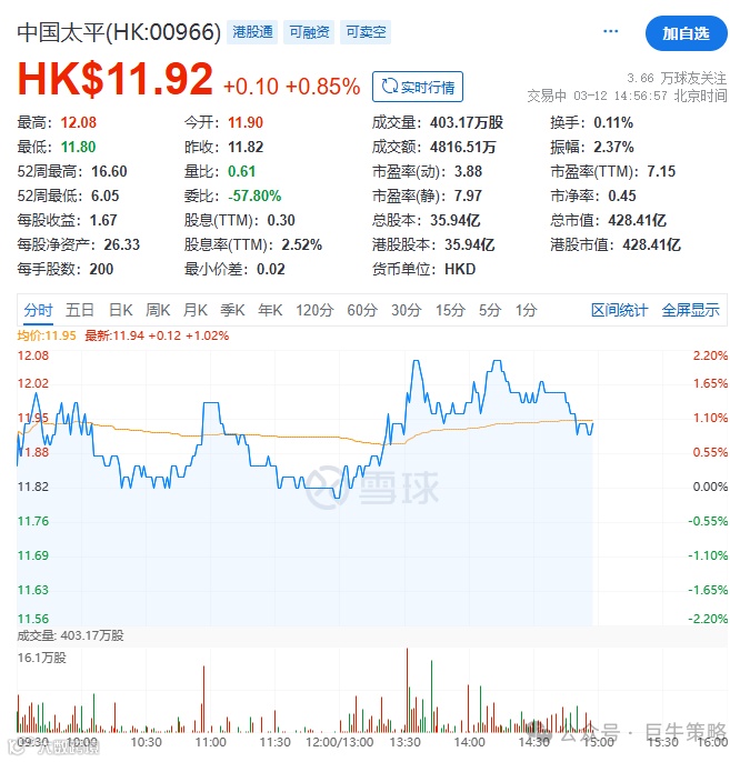 今天我们分享的股票标的是保险业巨头中国太平(HK00966)以下是对中国太平(00966.HK)的看多分析,结合其基本面、行业趋势及市场动态的综合研判: