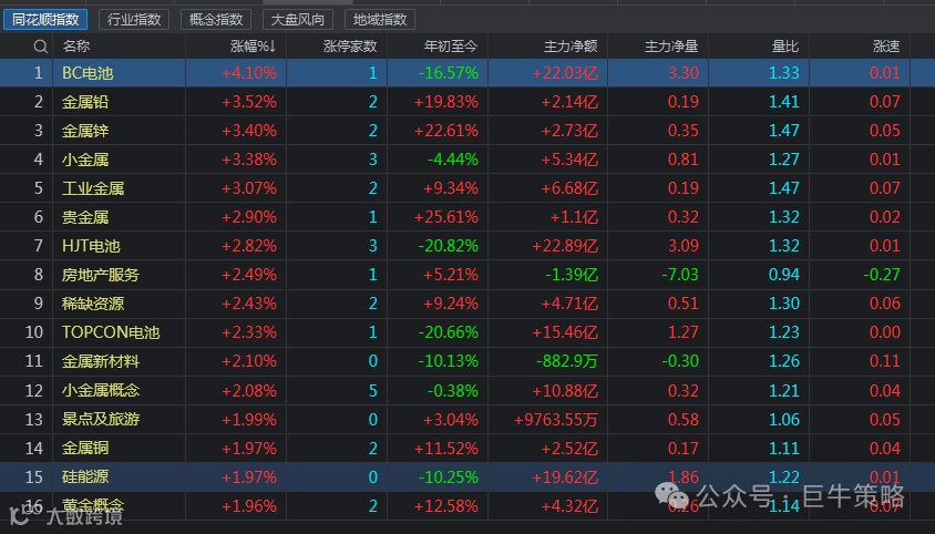昨天广州跟进放开限购和房贷利率,房地产板块早盘异动,但最终被金属板块和电池板块反超。
