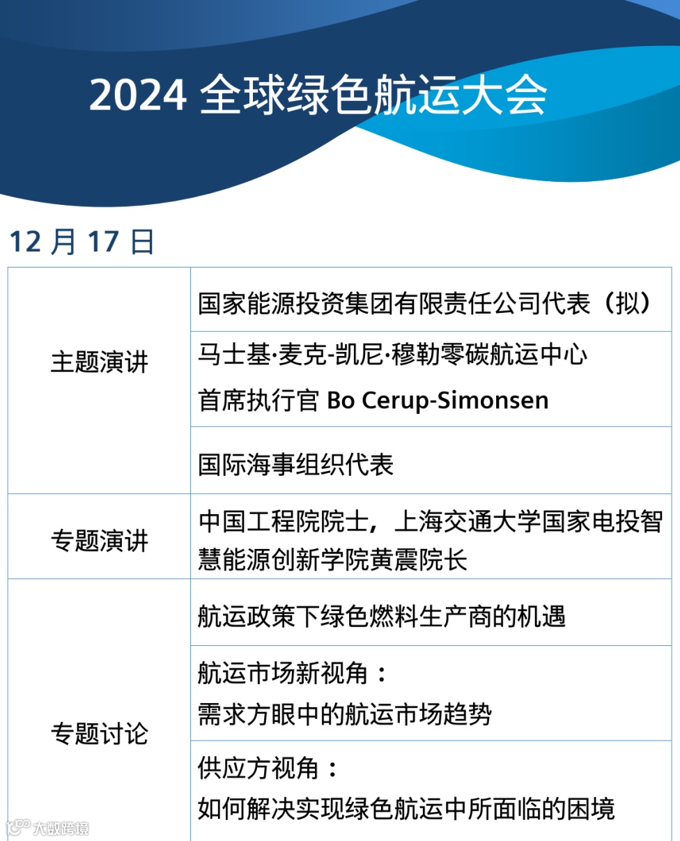 2024全球绿色航运大会将于12月17日至18日在海南儋州海花岛国际会议会展中心举行。本次大会由西门子能源与A.P. 穆勒 - 马士基集团联合主办,以“迈向零碳未来——创新与合作推动绿色航运”为主题,汇聚全球政策制定者、行业领袖及技术专家,共同探讨绿色燃料的规模化应用、低碳航运技术的创新突破以及国际合作的新路径。