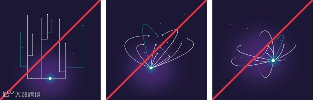 进阶的小伙伴们在创作不同的Dot Sphere形式时,请一定参考brandville网站对于设计的要求,规避以上3种不准确的用法。如:几何线条的组合(左)、有象形意义的图案,如心形(中)以及像类似特殊意义的符号如核能符号(右)。