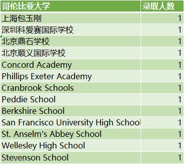 哥伦比亚大学:13人(大陆中学4人,海外高中9人)