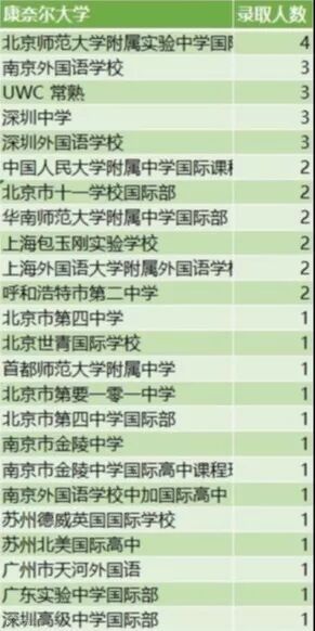 康奈尔大学:84人(大陆中学54人,海外高中30人)