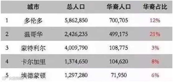 加拿大华裔居住最多的城市中,多伦多当仁不让排名第一,华裔70万;第二名温哥华,差几百个人就50万(加上留学生、陪读家长、工签和探亲的,总数很可能达到60万)。