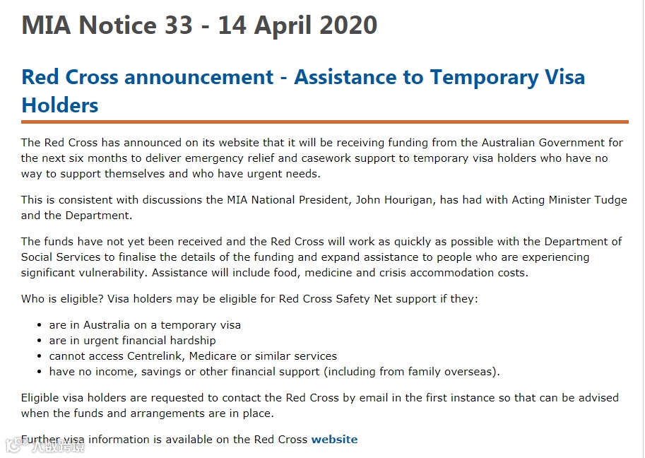 根据4月14号的消息,红十字会将在未来6个月内从澳洲政府获得资金,以帮助有紧急需求的临时签证持有人。红十字会目前还未收到救助金额,但接下来会将尽快和社会服务部(Department of Social Services)沟通确定有关资金和援助细节。援助内容将包括食品、药品和住宿费用等方面。