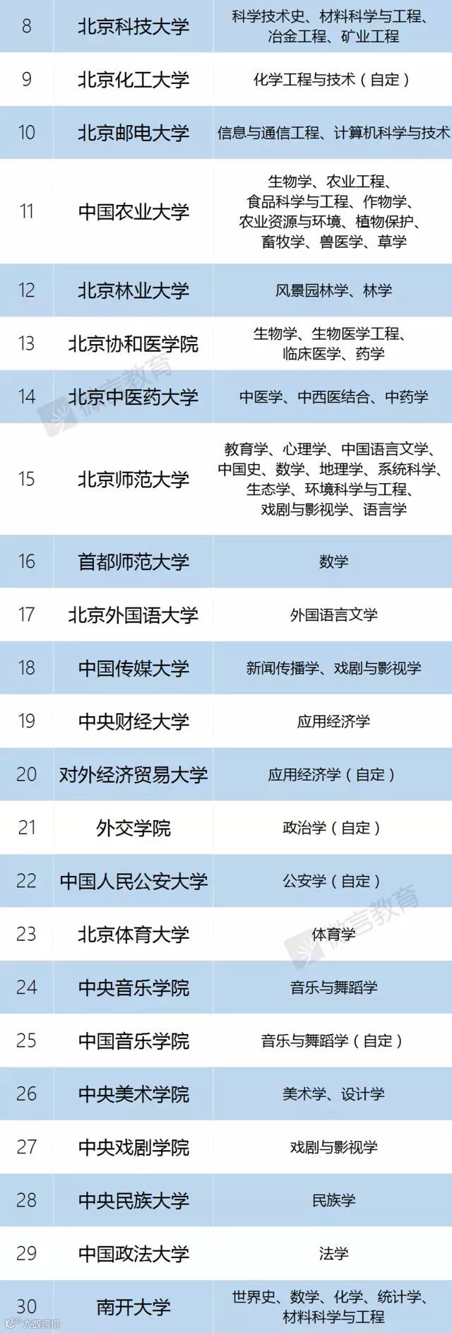 中央民族大学:民族类高校,民族学第一。其他无太强势学科和专业。