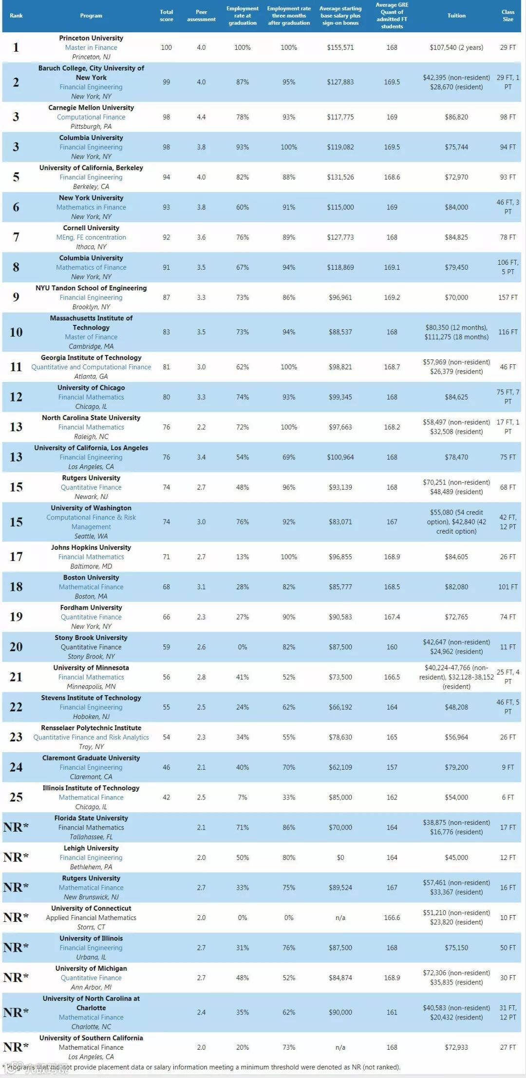 2019年11月至12月,QuantNet在入学、就业和职业服务信息方面,对38个金融工程,数学金融,定量金融硕士课程进行了调查。QuantNet排名依据: