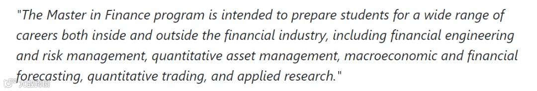 “金融硕士课程旨在帮助学生为金融行业内外的各种职业做好准备,包括金融工程和风险管理,定量资产管理,宏观经济和金融预测,定量交易和应用研究。”