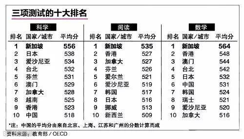 英美教育在国内一直很火,但是很多人却对新加坡的基础教育知之甚少,直到2015年,全球经济合作与发展组织颁布了全球最大规模基础教育排名,新加坡位居全球第一,而英国美国都排在二十名开外。在2016年,全球经济合作与发展组织统计并公布的全球最大规模基础教育排名的PISA考试中,全球76个国家,15岁孩子抽样统一考试,新加坡孩子在科学、阅读、数据的三项测试中都独占鳌头,位列全球第一。
