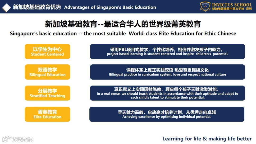 新加坡的教育体制以菁英教育为目标,承袭英国教育传统,采用英联邦的教育体制,又兼中式教育优势,既保留中国的基础教育优势又教授西方的先进理论,新加坡中西合璧的菁英教育被誉为最适合华人的世界级菁英教育。