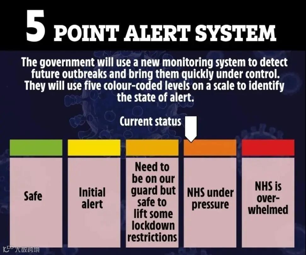 最安全的1级是新冠病毒已完全在英国消失,只可能在疫苗投入使用后发生。最危险的5级是因为新冠病毒击穿国民医疗系统NHS。