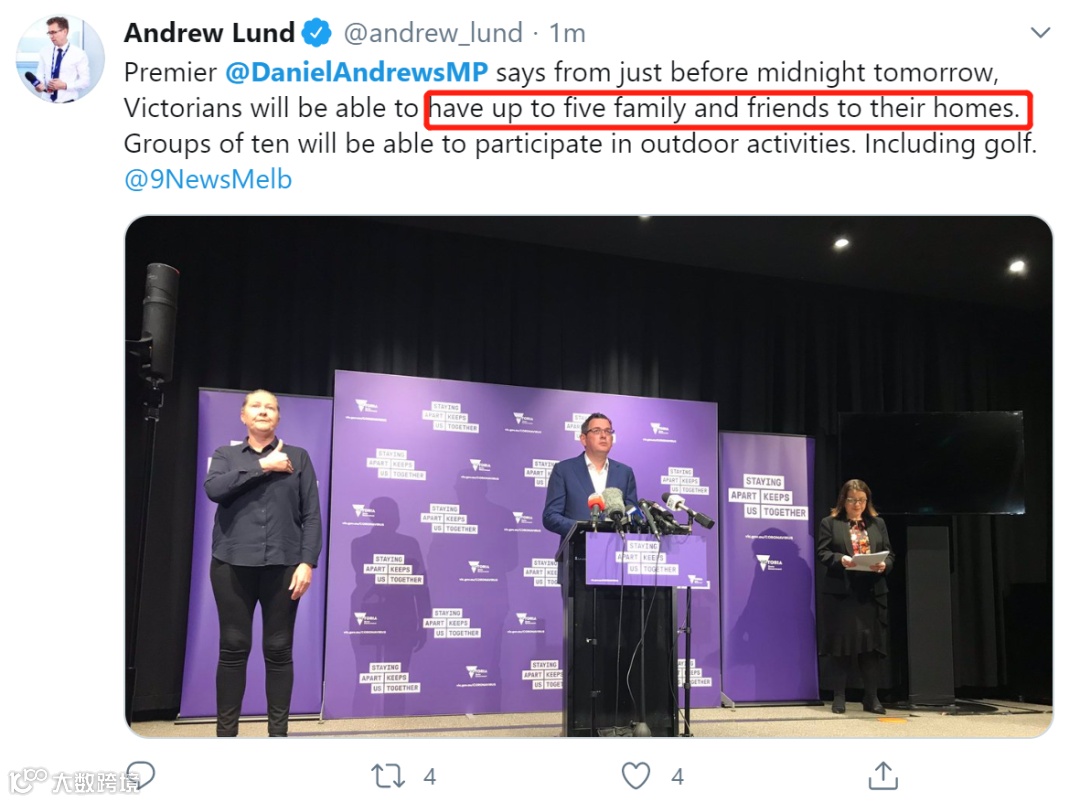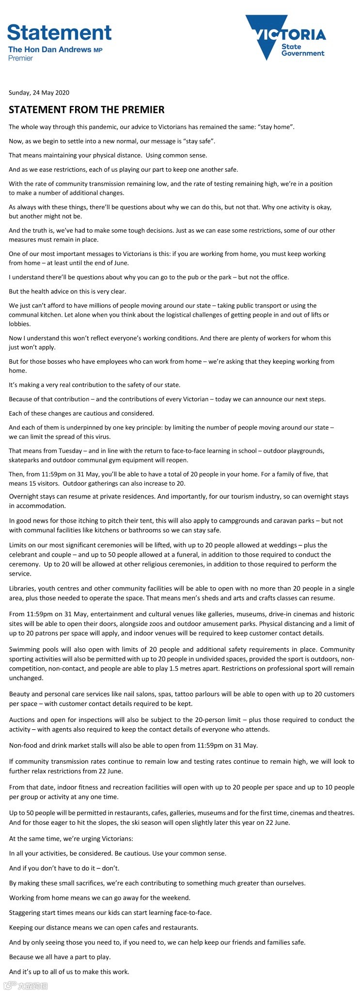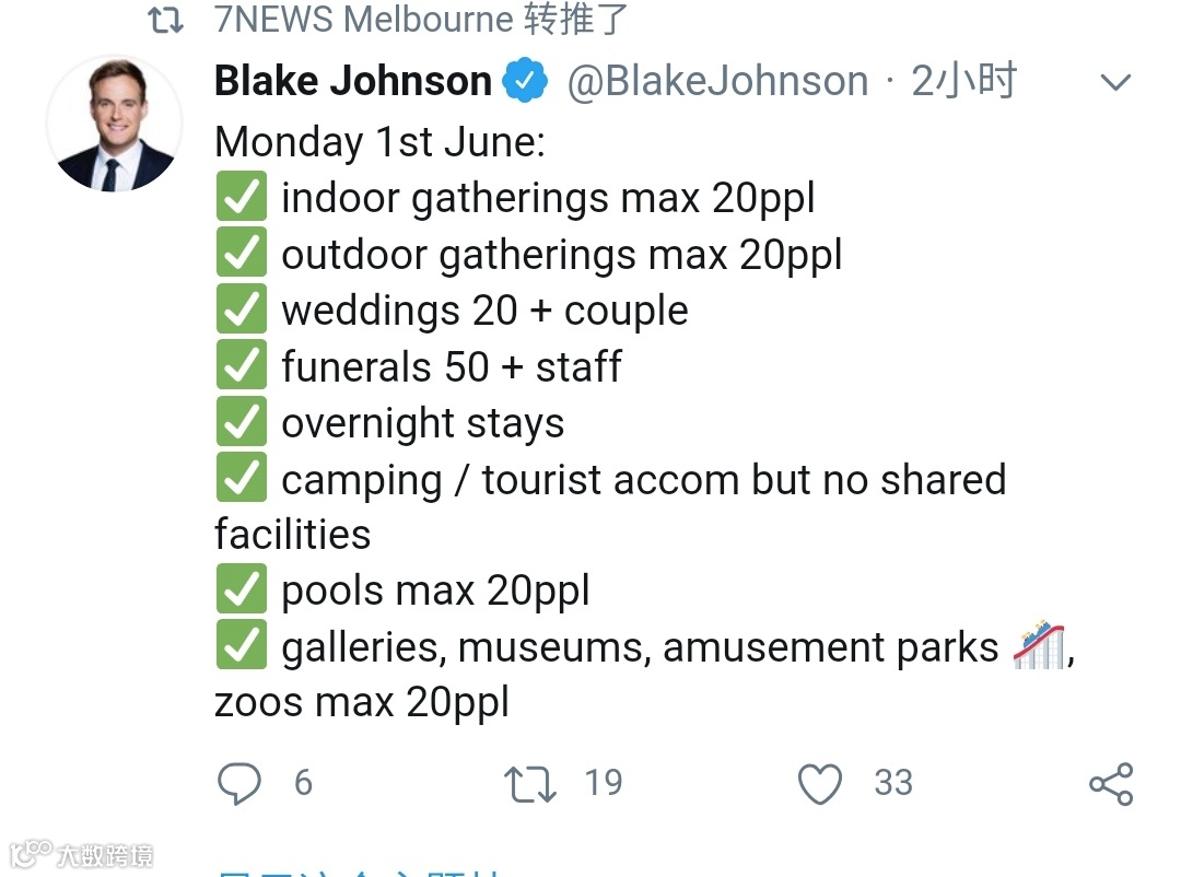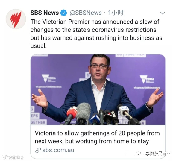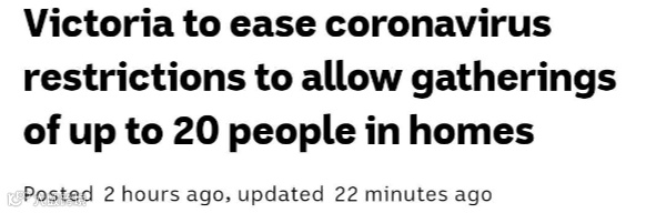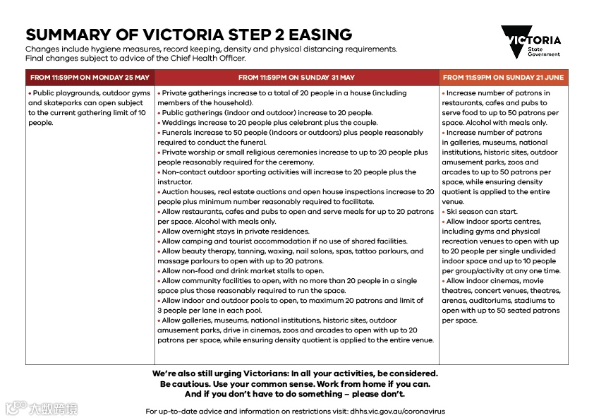 今天上午,维州州长召开会议,宣布了第二阶段解封的细则。从下周日(5月31日)晚23:59起,维州将进入第二阶段解封。室内外聚会允许20人;婚礼允许20人参加;葬礼最多可以有50人参加;更多的公共场合将被允许开放;咖啡店,餐馆,酒吧等允许20人同时用餐。