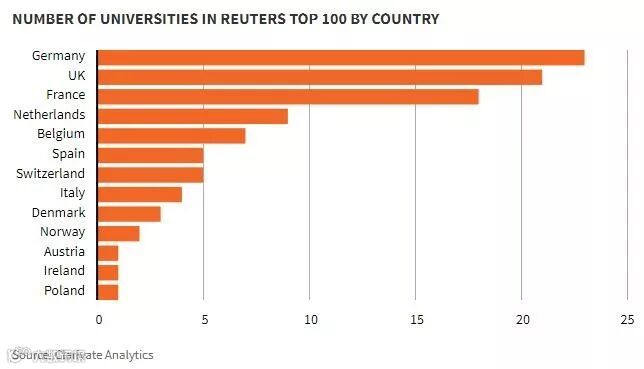 今年的欧洲最具创新力大学榜单中,德国高校的上榜数量最多,有23所大学,与去年持平;英国没有受到脱欧的影响,以21所高校上榜排在第二位;法国有18所大学上榜,名列第三。