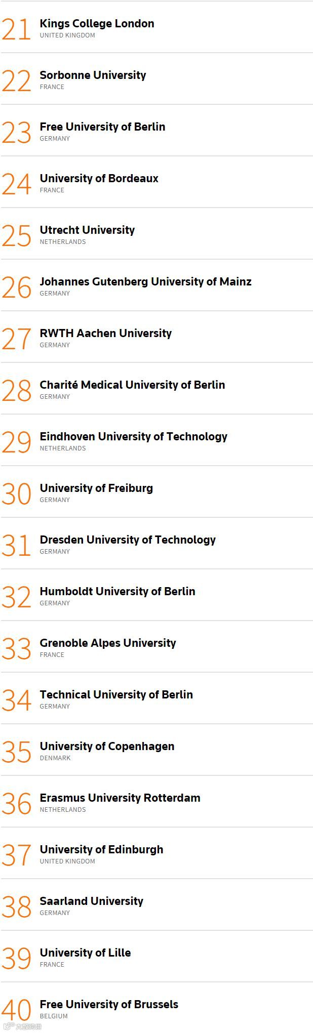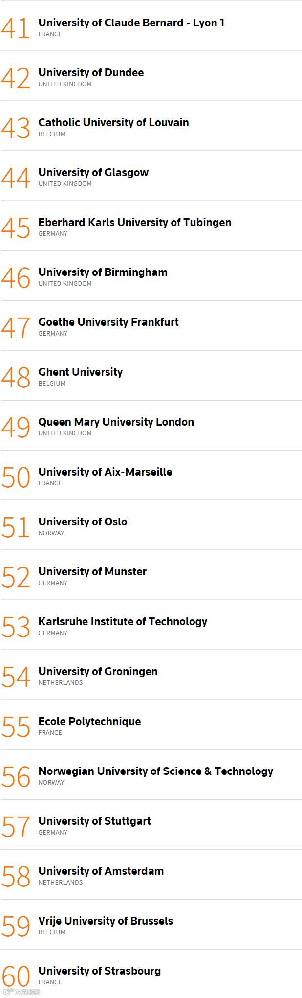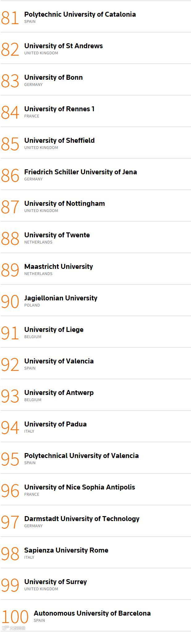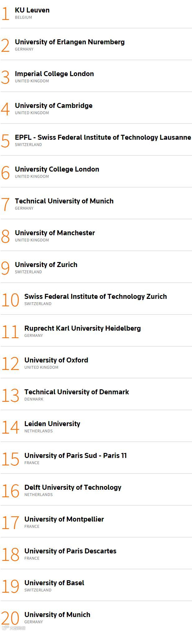 第一名依旧是比利时的鲁汶大学,已经连续4年获得这个项目的第一。