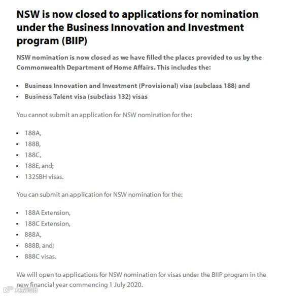 重磅消息!据澳洲新南威尔士州(悉尼)官方公布,新州全系列投资移民州担保申请关停!受影响签证包括132A\B、188A、188B、188C、188E!