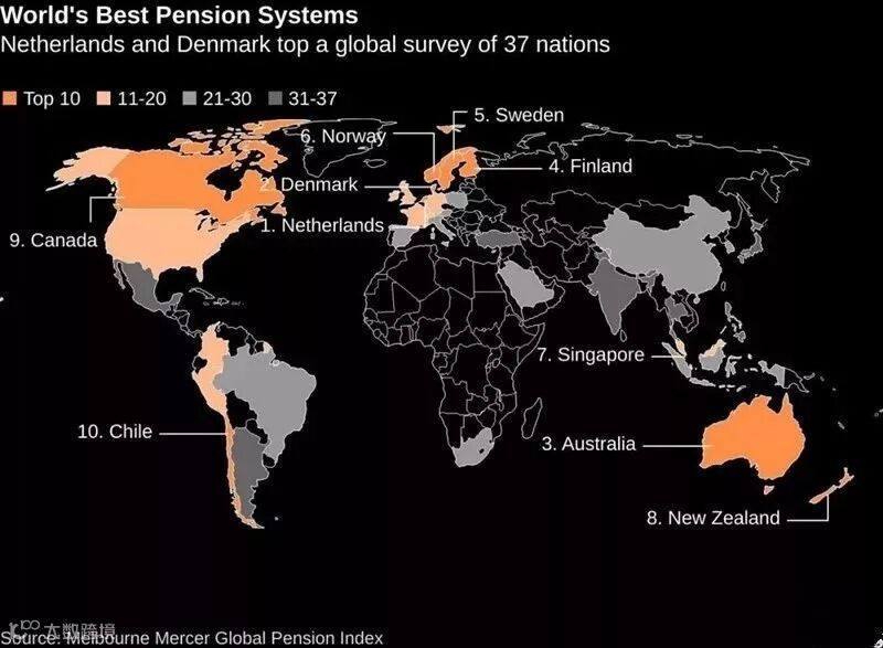 根据墨尔本美世全球养老金指数(Melbourne Mercer Global Pension Index)显示,2019年,全球养老金指数前三名分别是:荷兰、丹麦、澳大利亚。其他进入前十名的国家分别是:芬兰、瑞典、挪威、新加坡、新西兰、加拿大、智利。
