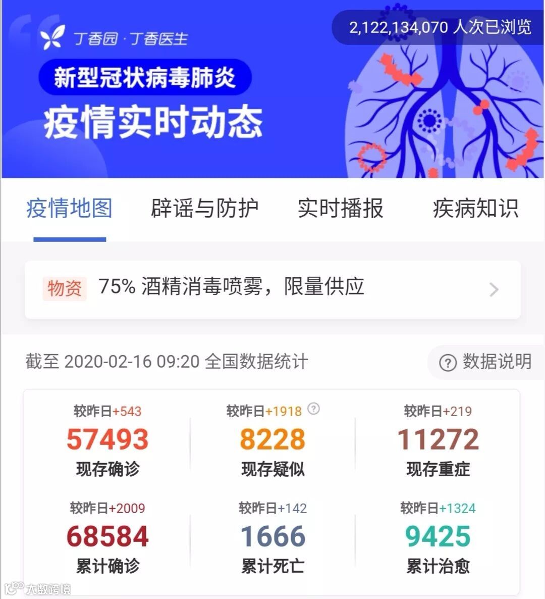 截至2月16日9时20分,全国已确诊新型病毒肺炎患者57493例,疑似8228例,死亡1666例,治愈9425例。